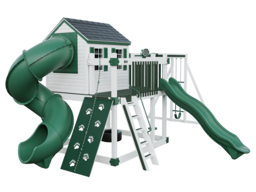 If you are looking for a playhouse that offers a lot of fun and adventure, look no further than this awesome model. It features a spacious playhouse that is suspended on top of an 8ft x 9ft tower, giving you a great view of your surroundings. To access the playhouse, you can climb up the 5ft ladder with railing or the bear paw climber. The playhouse has two 3ft x 8ft porches on the deck, where you can enjoy the fresh air and relax. The deck also has some fun items like a steering wheel, binoculars and spotlight, which let you pretend to be a captain, a spy or a star. Inside the playhouse, you have the option to slide down the 7ft turbo twister, which is thrilling and exciting. You can also have fun swinging with 4 different options, such as a belt swing, a trapeze bar, a cyclone disk and a tire swing. You can also challenge yourself to climb from one side of the tower to the other using the climber beam. This playhouse is perfect for kids who love to explore, play and have fun.