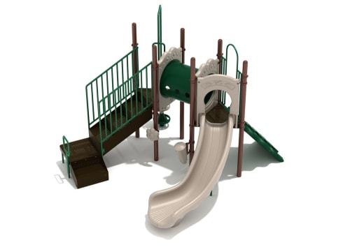 Worthy Courage is an ADA-compliant commercial grade system that combines physical challenges with interactive play activities. Wallop the Single Drum to kickoff the musical expression. Spark imagination by turning the flower-shaped Rain Wheel to conjure up the sounds of a mighty storm and voyage the seven seas. Traverse skyward in one of two ways: a Figure Climber and a Pod Climber. The educational Figure Climber boosts fine motor and math skills with numbered hand and foot grips. Preschoolers in particular will want to try and climb the Pod Climber’s goofy circular steps and reach new heights. Shimmy into the Tube Bridge and jet down the Right Turn Slide for added fun. Silliness from the audio components will mix with the happy hollers from the runners and sliders to draw even more friends to join the fun. Worthy Courage comes in a primary and neutral color scheme but can be customized to fit specific needs.
